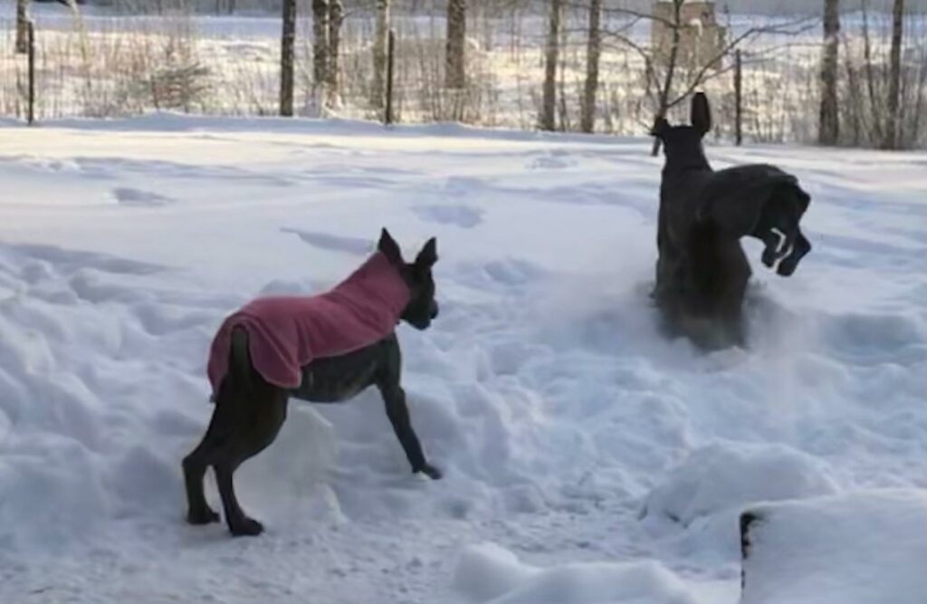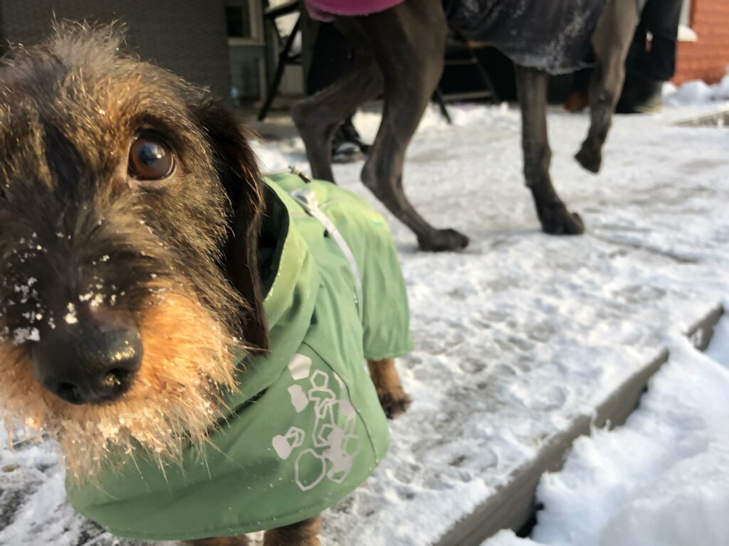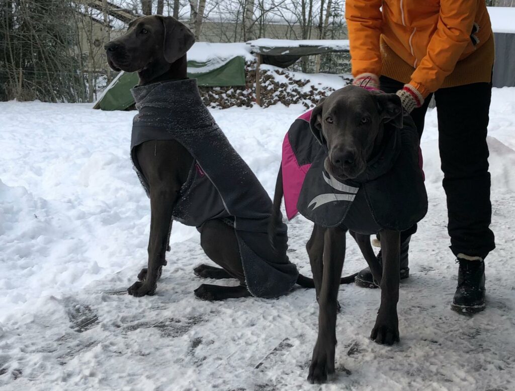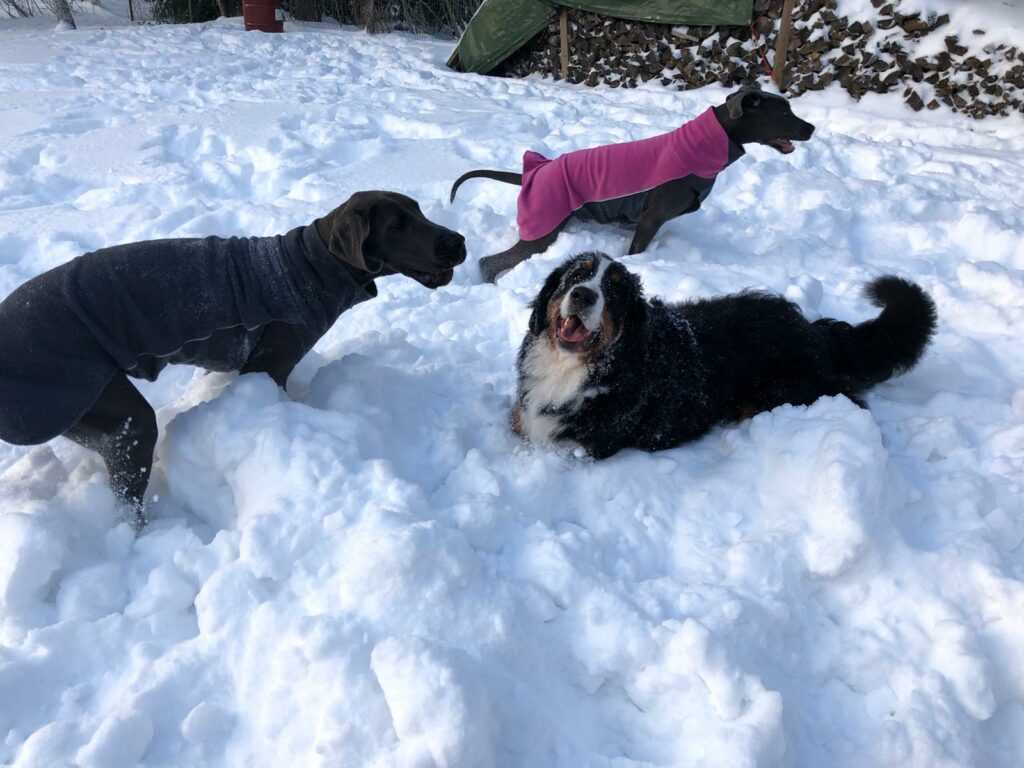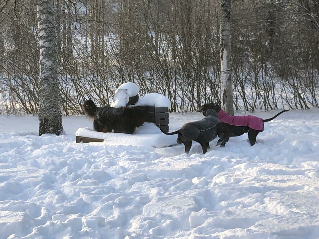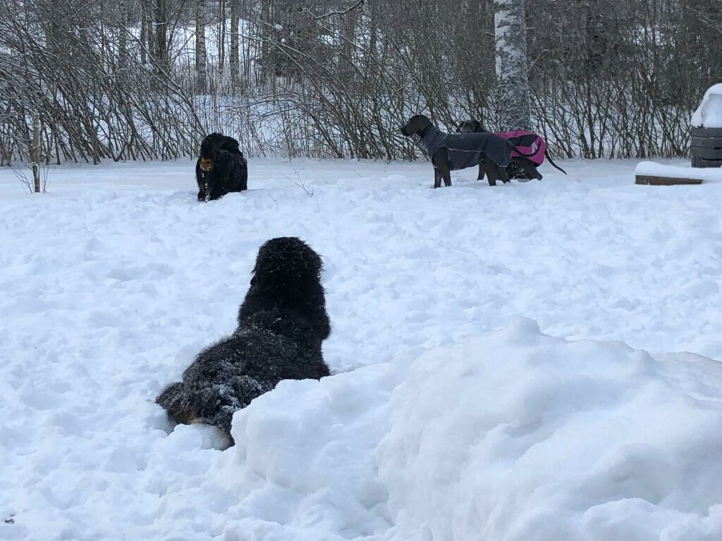 Viiden tyttökoiran lauma humpsahti pihamme lumihankeen tuosta vaan. Etenkin Venlalla ja Nandalla tuntui leikit menevän tosi hyvin yksiin – vaikka yhtä lailla spurttailut, hammastelut ja painimatsit sai aikaan myös Nyytin kanssa, ja intoutui Meenakin sopivissa määrin kakaroiden vauhtiin. Ei ehkä yllätä, että kovimmat rallit pihalla järjestyivät nuoriso-osaston toimesta (ikäjärjestyksessään Nanda, Venla ja Nyyti).