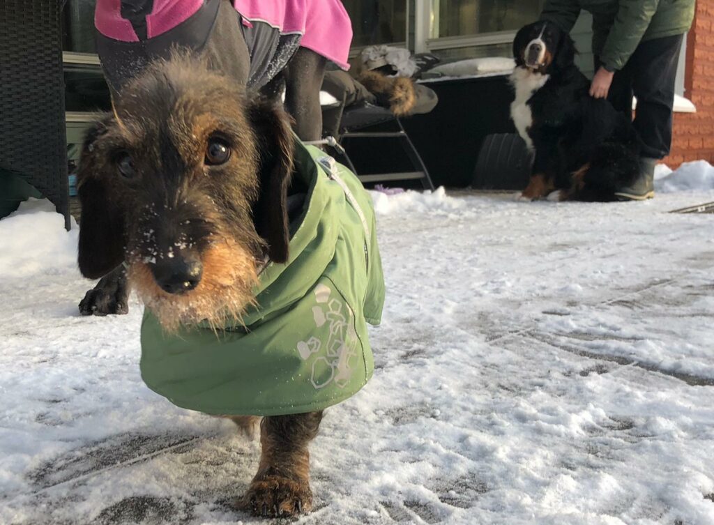 Tiitu-mäyräkoira katsoi parhaimmakseen pitäytyä enemmän terassin turvassa, poissa isojen koipien keskeltä. Ja jos oikein surkealta yritti näyttää vähän vielä tärisi, niin pääsi hellämielisten tätien syliin saamaan erityiskohtelua. No mutta sitähän pitää tulla vähintään jo siksi, että Hän on kuitenkin Mäyräkoira!