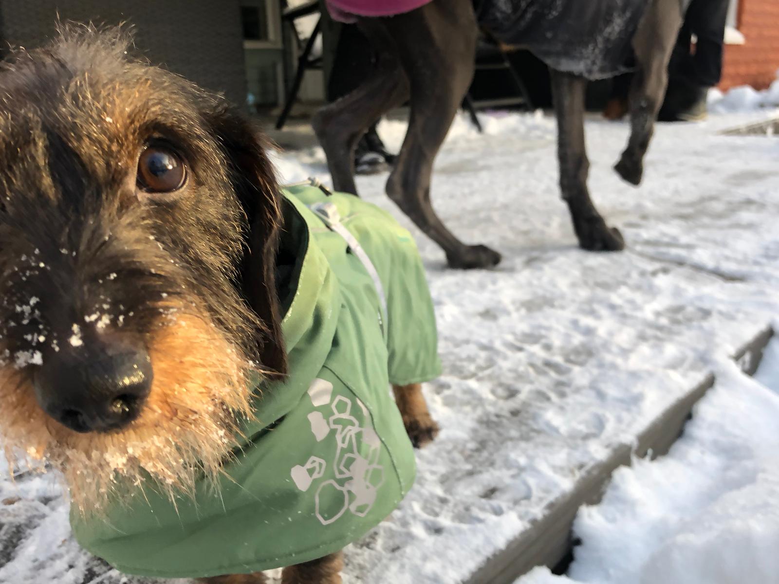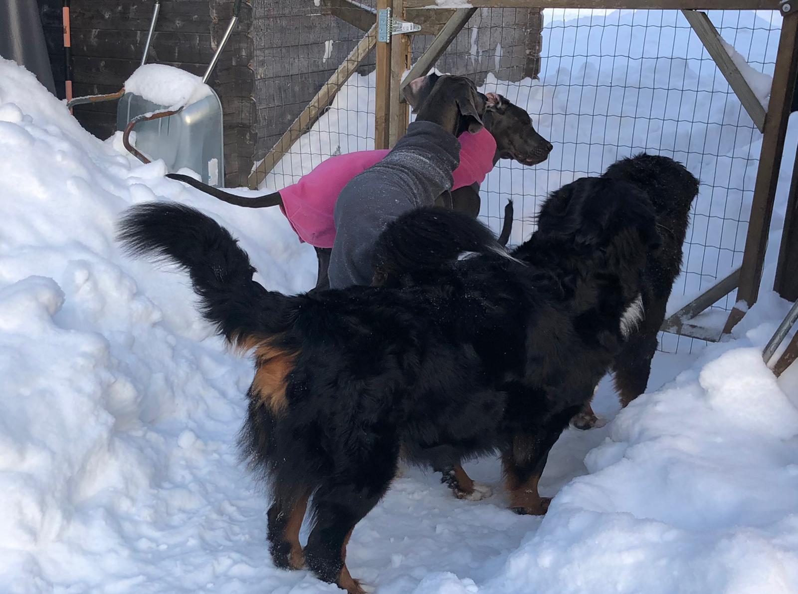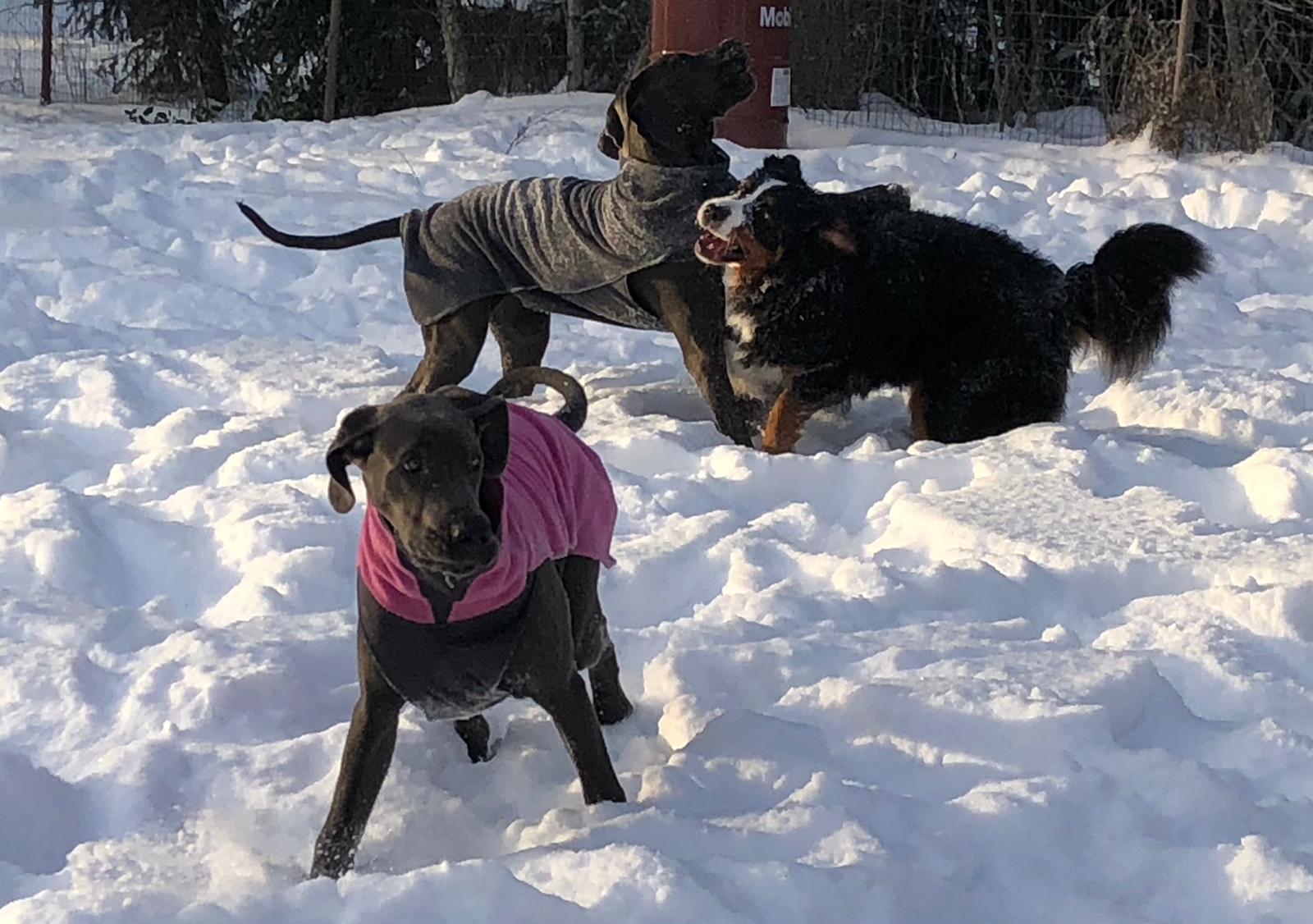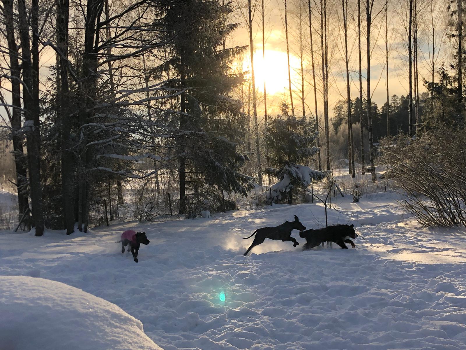 Viiden tyttökoiran lauma humpsahti pihamme lumihankeen tuosta vaan. Etenkin Venlalla ja Nandalla tuntui leikit menevän tosi hyvin yksiin – vaikka yhtä lailla spurttailut, hammastelut ja painimatsit sai aikaan myös Nyytin kanssa, ja intoutui Meenakin sopivissa määrin kakaroiden vauhtiin. Ei ehkä yllätä, että kovimmat rallit pihalla järjestyivät nuoriso-osaston toimesta (ikäjärjestyksessään Nanda, Venla ja Nyyti).