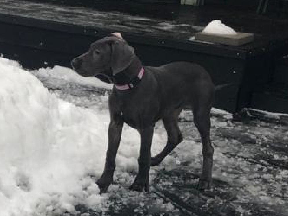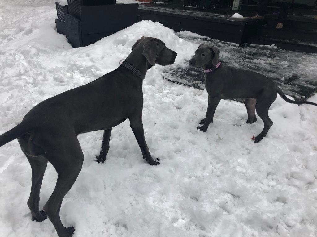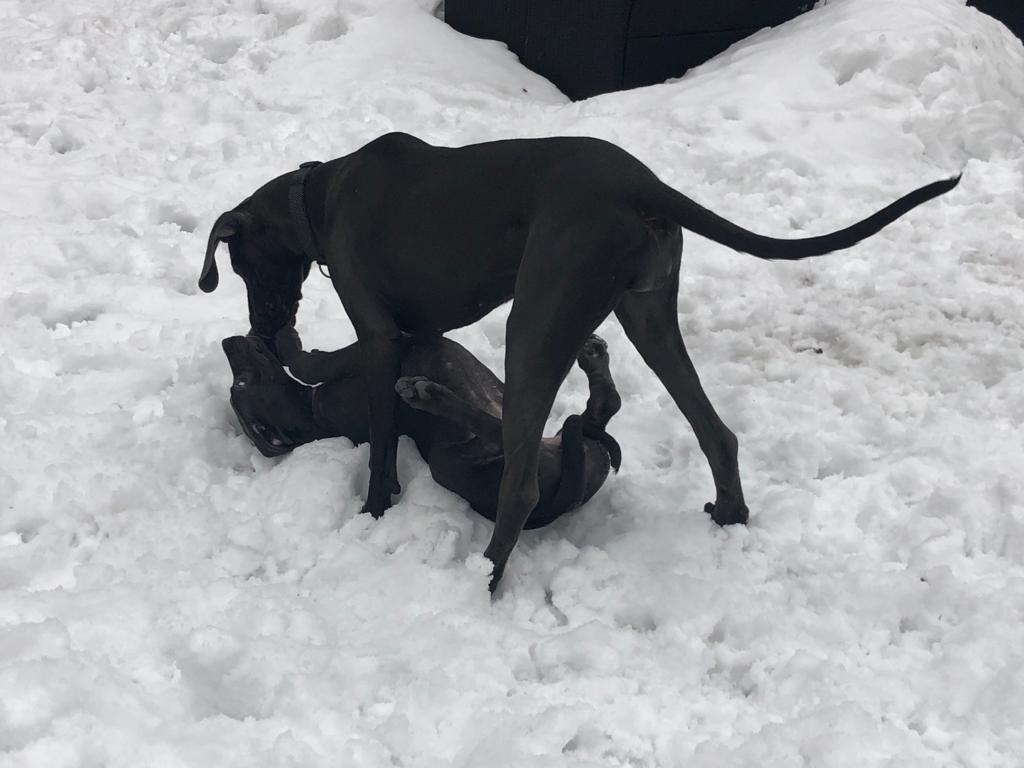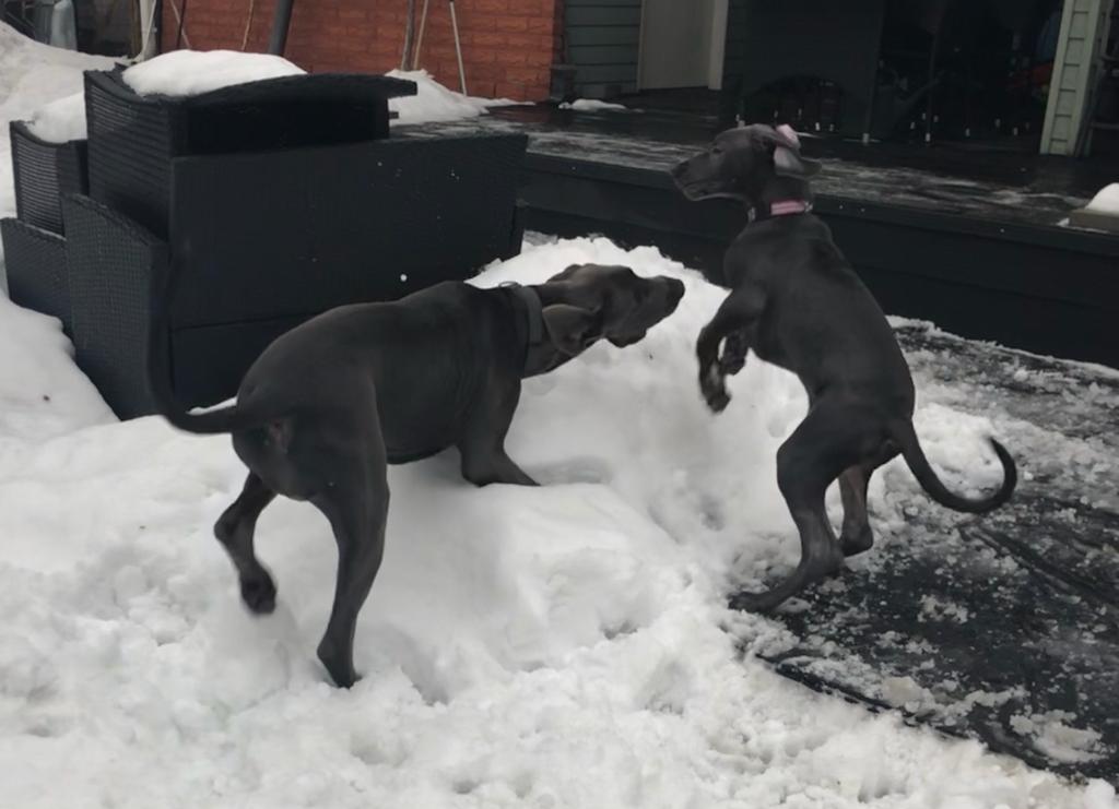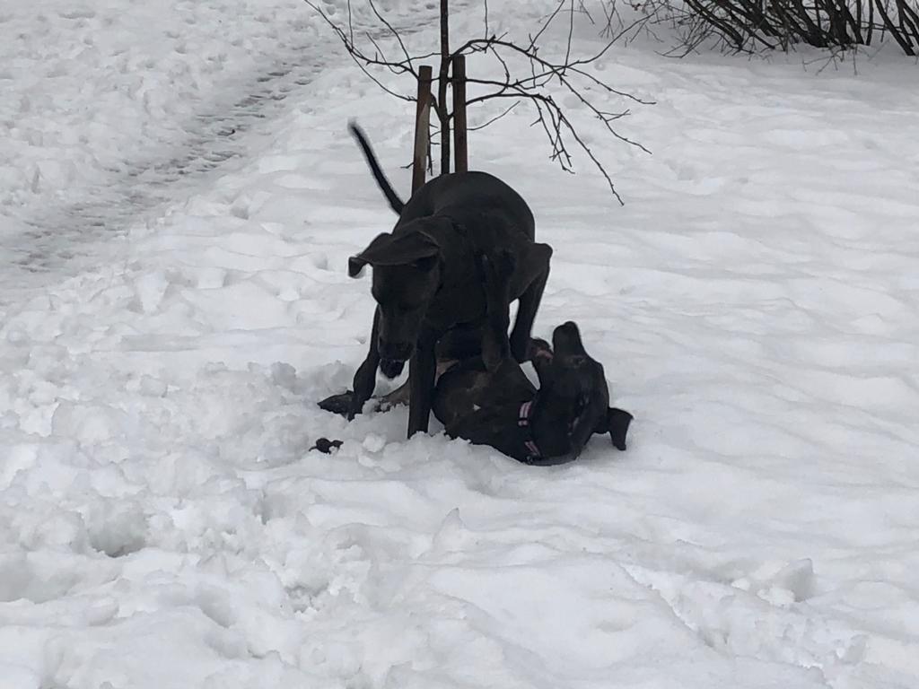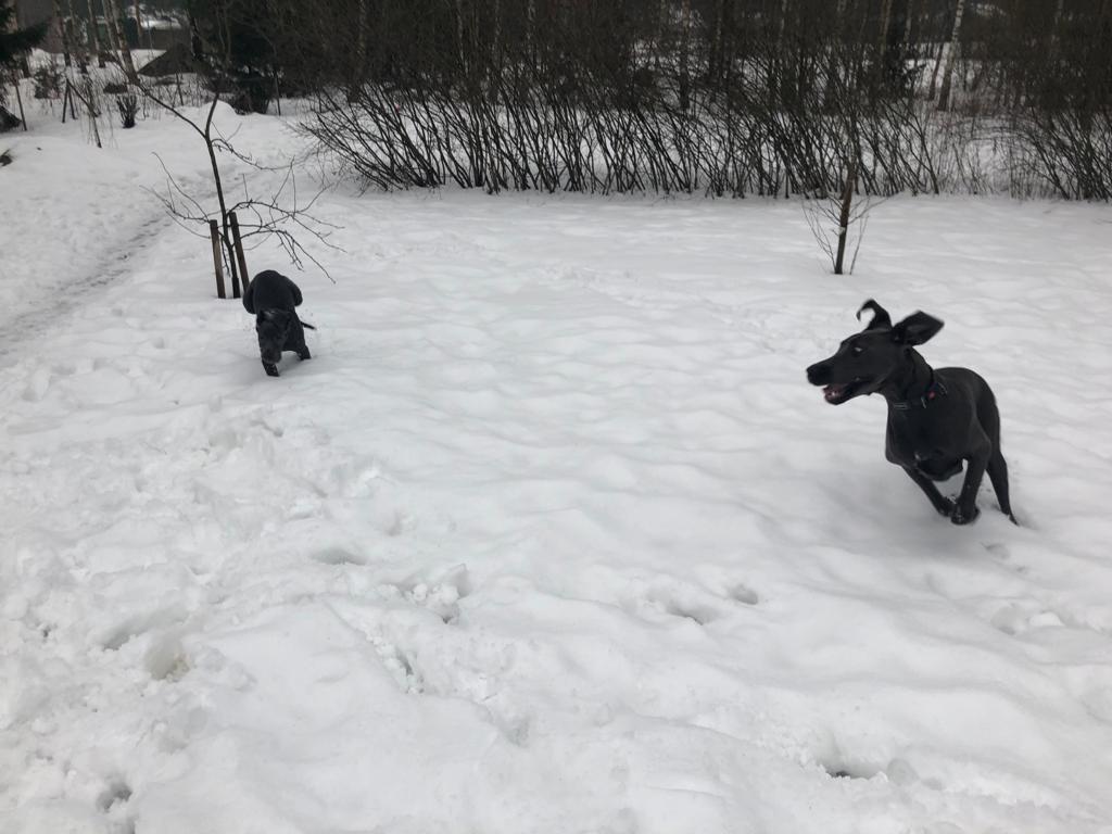 Ja entä Armi sitten? Armi tapasi ekaa kertaa näin isoa koiraa sitten pentulaatikon. Se ei ollut moksiskaan Venlan koosta tai innokkuudesta, ja ei kovinkaan montaa sekuntia myöhemmin molemmat siniset kohnot hyppivät toistensa päälle ja peräkanaa hangessa. Aivan samanlaiset vauhdikkat leikit molemmilla 😀