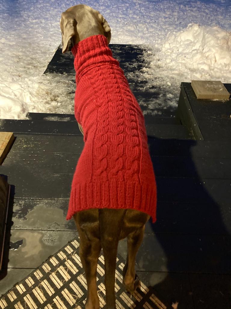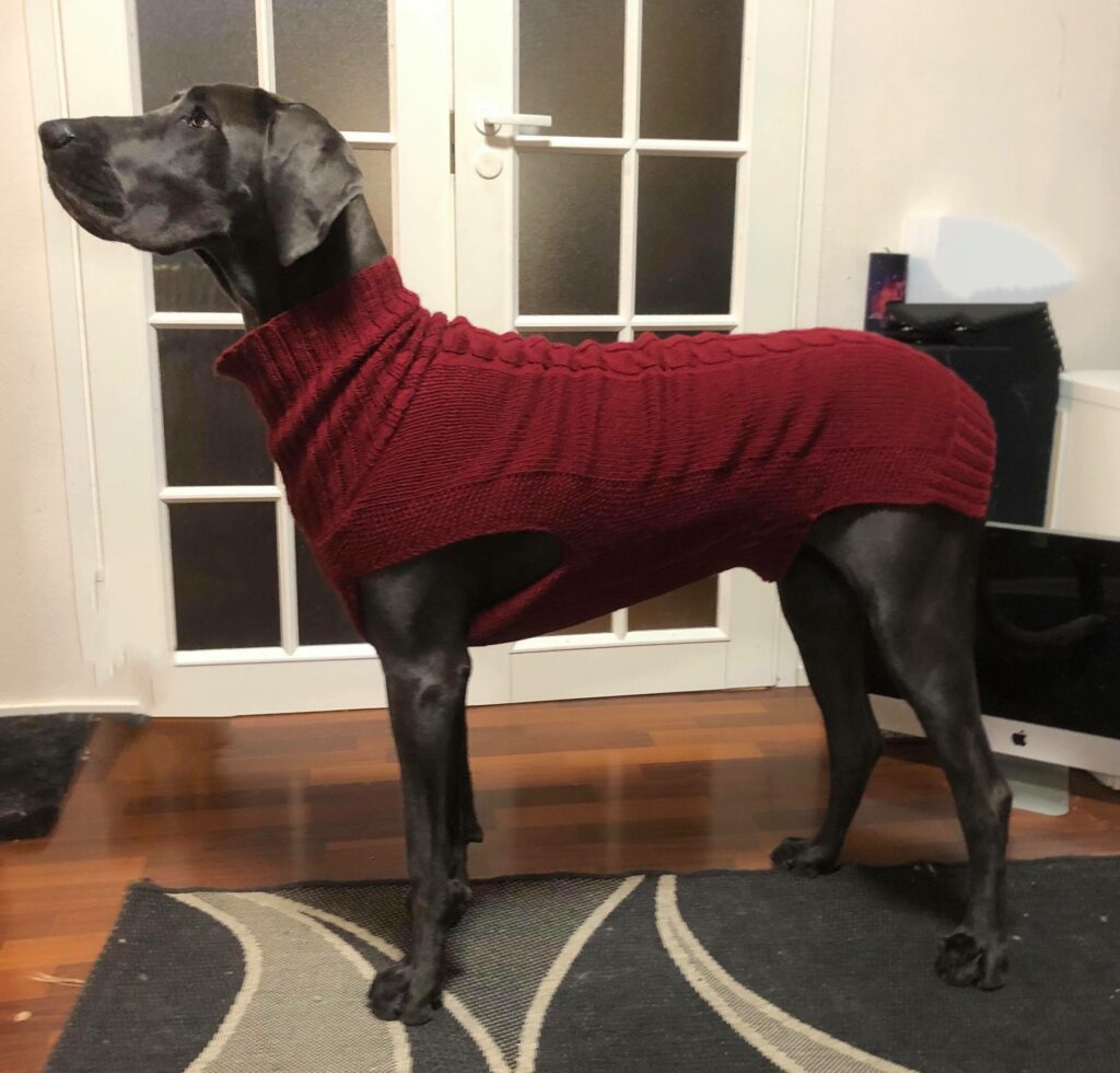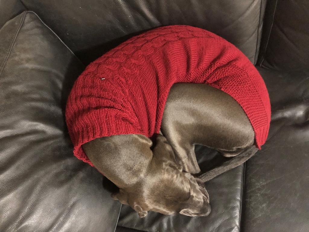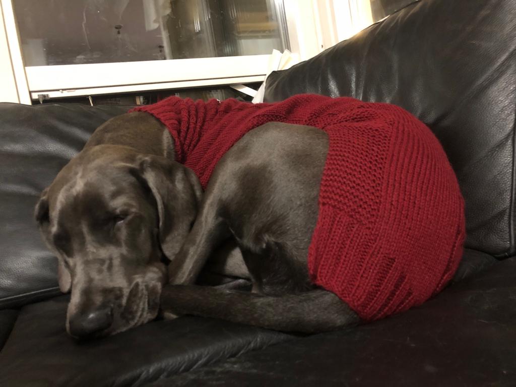 Sitten huomattiin, että tuo äärimmäisen yksinkertaisen nerokas mallipaidan malli ei vaan istu näin syvärintaiselle / nousevan vatsalinjan omaavalle koiralle, ainakaan näin älyttömän paljon isommaksi skaalattuna (selän pituus 30 cm -> 80 cm). Villapaita kävi sovituksessa, sitten asemointeja korjattiin, sovitettiin uudestaan, korjattiin vähän lisää… Se on todellakin neulottu päälle Venlalle.