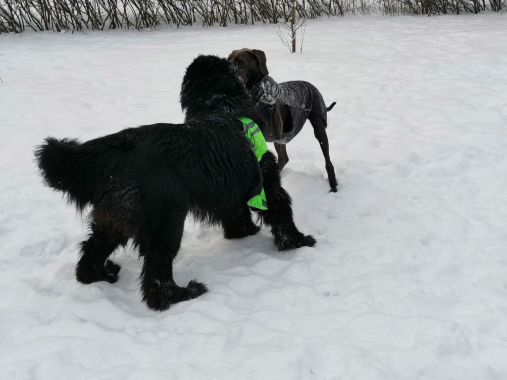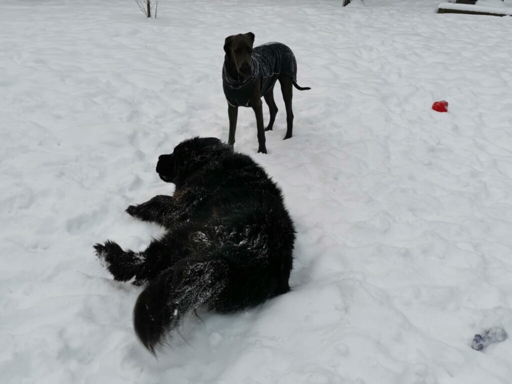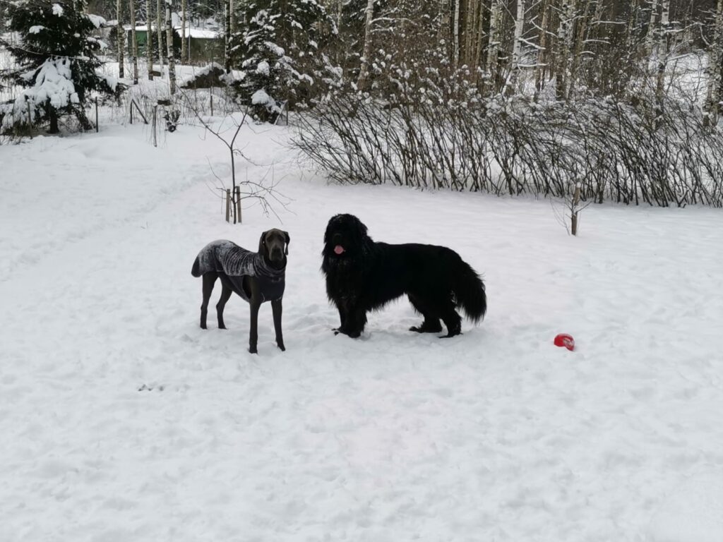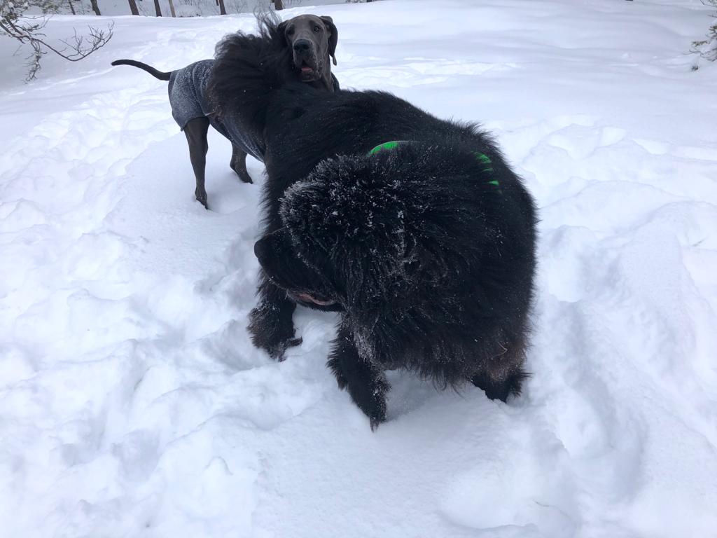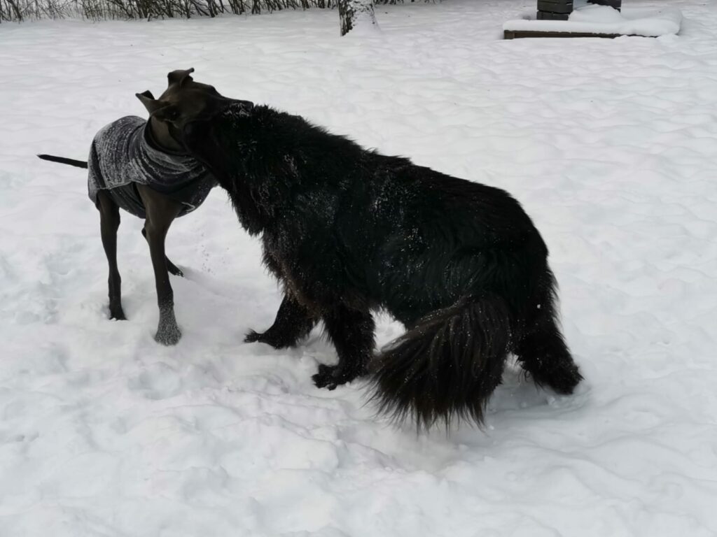 Ja sitten tälle päivälle tavattiin vielä Waldoa! <3 Ah, ihanaa 🙂 Myös me kävimme metsälenkillä, ja sen päätteeksi vielä pientä piharallattelua tässä kotipihalla. Venlan ja Waldon leikeissä oli hauska ero: metsässä se oli taas Venla, joka oli selällään lumihangessa ja selkeästi altavastaavana, mutta kun tultiin meidän pihalle, roolit vaihtuivat – Venla vei ja Waldo wikisi! 😀 (kuvat kotipihalta otti Laura):
