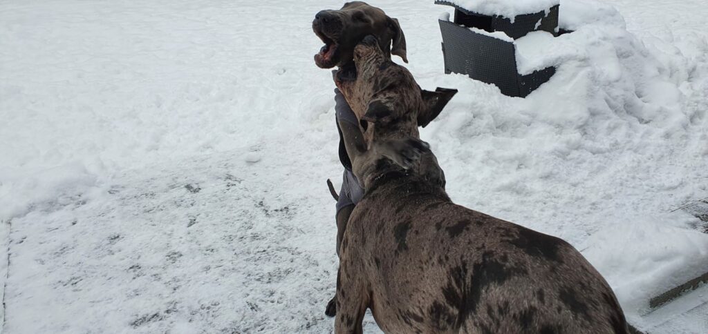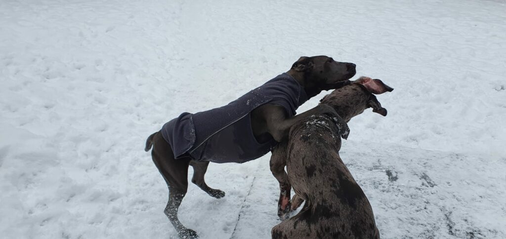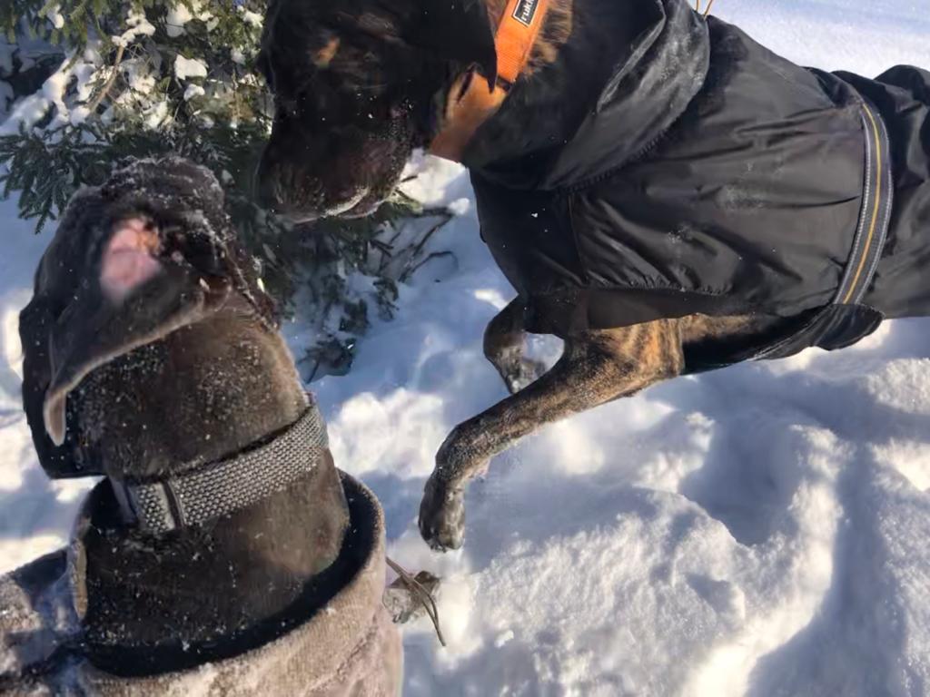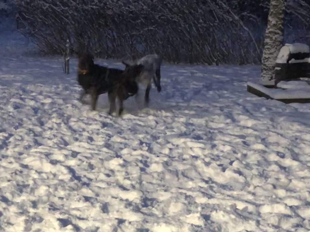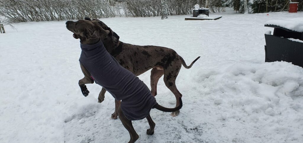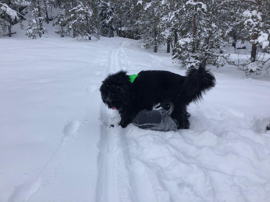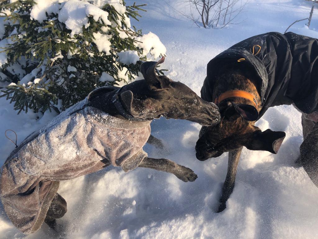 Ja sitten tälle päivälle tavattiin vielä Waldoa! <3 Ah, ihanaa 🙂 Myös me kävimme metsälenkillä, ja sen päätteeksi vielä pientä piharallattelua tässä kotipihalla. Venlan ja Waldon leikeissä oli hauska ero: metsässä se oli taas Venla, joka oli selällään lumihangessa ja selkeästi altavastaavana, mutta kun tultiin meidän pihalle, roolit vaihtuivat – Venla vei ja Waldo wikisi! 😀 (kuvat kotipihalta otti Laura):