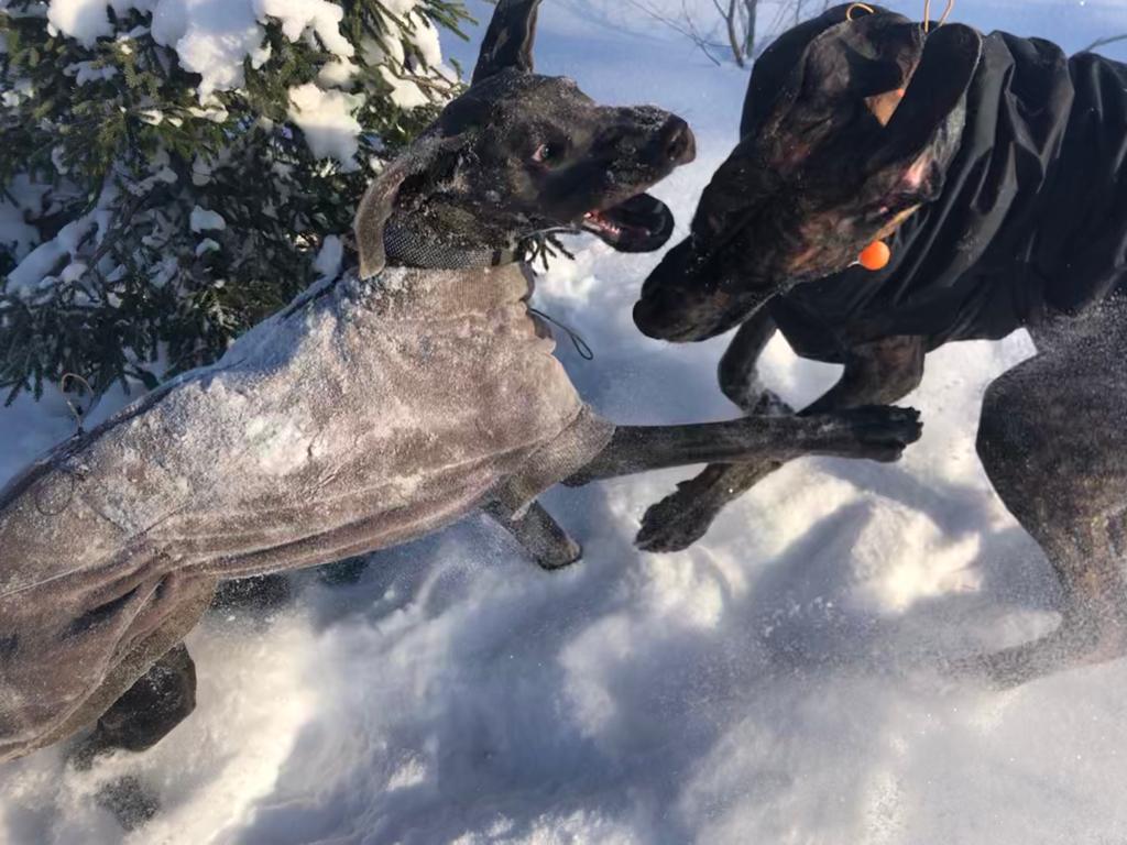 …Ja siitä syystä olikin hyvä ottaa treffit uusiksi heti lauantaina, ja suunnata päiväsaikaan metsälenkille. Minua harmittaa nyt todella paljon, että Pamps ei tallentunut yhteenkään kuvaani metsässä, mutta mukana pikku tirriäinen tuli! Metsäily kolmen koiran kanssa meni jotakuinkin näin: Venla innosti Smeen juoksemaan, ja spurtin päätteeksi Venla löytyi Smeen kyydittämänä selältään lumihangesta. Kun Venla oli saanut isommaltaan riittävän monta lumipesua, se siirtyi helpompaan kohteeseen, eli Pampsin luo. Liian vauhdikkaat leikkiinkutsut saattoivat saada Pampsin huomauttamaan, että nyt vähän varovaisemmin niiden isojen tassujen kanssa. Mutta aina silloin tällöin Pamps innostuikin spurttailemaan doggien kanssa (voi miten mainoita voivatkaan pienen whippetin vauhdikkaat spurtit olla!), vaikka muuten pääsääntöisesti kulkikin Hannan vierellä. Seuraavaksi Venla, tai Smee, aloitti taas uuden spurttailukierroksen, ja rundi alkoi alusta. 🙂