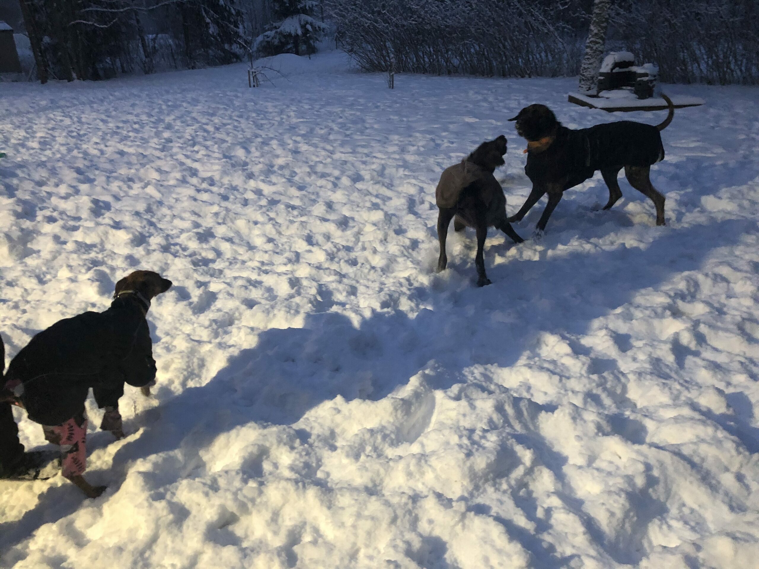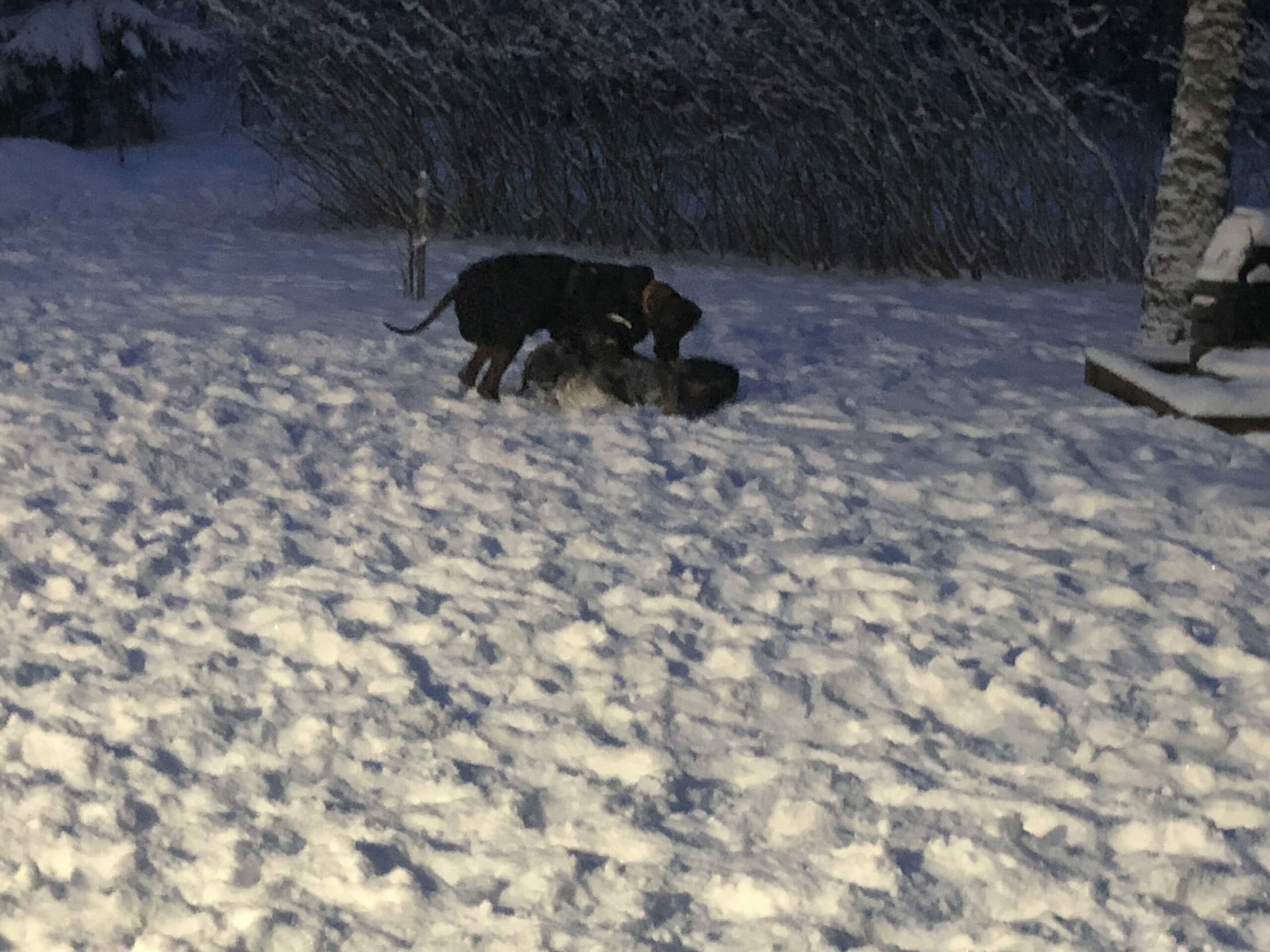 Ja sitten tälle päivälle tavattiin vielä Waldoa! <3 Ah, ihanaa 🙂 Myös me kävimme metsälenkillä, ja sen päätteeksi vielä pientä piharallattelua tässä kotipihalla. Venlan ja Waldon leikeissä oli hauska ero: metsässä se oli taas Venla, joka oli selällään lumihangessa ja selkeästi altavastaavana, mutta kun tultiin meidän pihalle, roolit vaihtuivat – Venla vei ja Waldo wikisi! 😀 (kuvat kotipihalta otti Laura):