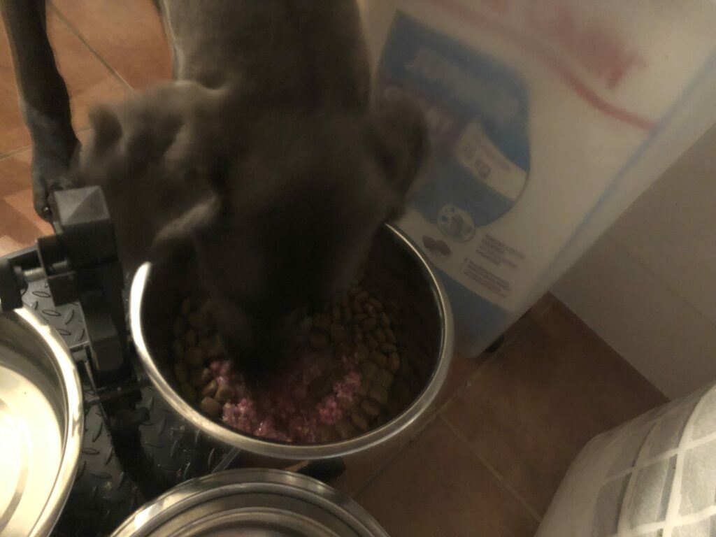 Ruokakuppiin putoaa hieman reilu 400 grammaa juniorinappuloita sekä 250 grammaa jauhelihaa, sinkkilisä (15 mg) sekä lohiöljy (1 rkl) kahdelle aterialle jaettuna. Lihoissa sopii kaikki tähän mennessä tarjottu: kalkkuna, broileri, lohi, possu ja nauta, ja näitä sen ruokakupista löytyy säännöllisesti vaihdellen.