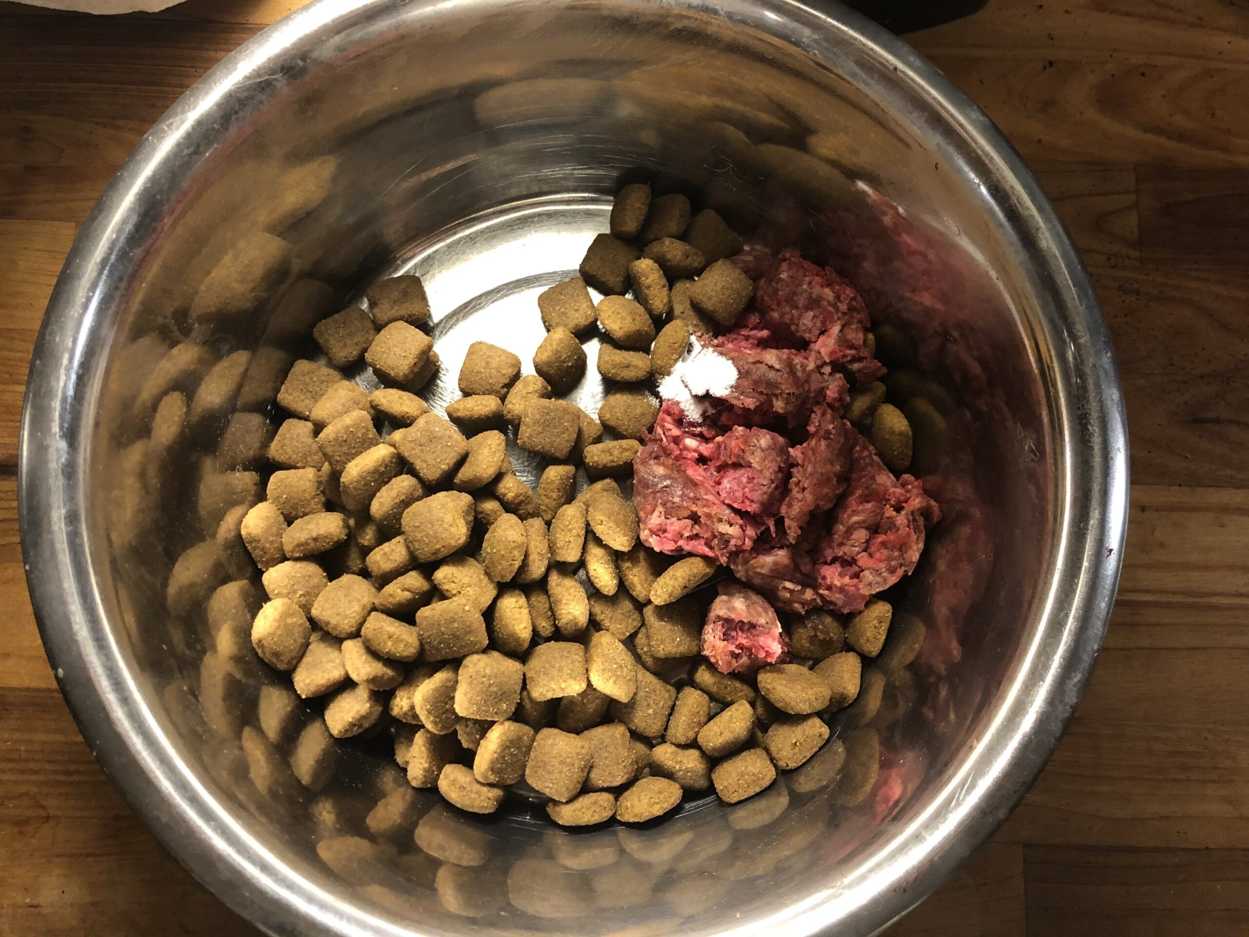 Nappulan lisäksi Venla syö Kennel-Rehun lihoja (linkki aukeaa uuteen ikkunaan). Alussa lihamäärät olivat pieniä, maisteluun ja totutteluun sopivia ruokalusikallisia. Lihan osuutta on nostettu maltillisesti, mutta tasaisesti, ja nyt 9,5 kk iässä koko päivän ruoasta neljännes on lihaa. Tavoitteenani ja tarkoituksenani on siirtää Venla 50-50-ruokinnalle, jossa noin puolet ruoasta on nappulaa ja puolet lihapohjaista. Suhdeluvuksi saattaa kehittyä lopulta vaikka 70-30, mutta yhtä kaikki – ajatuksenani on, että koira pystyy syömään monipuolisesti “vähän mitä vaan”, eikä sen maha menisi sekaisin äkillisistäkään muutoksista ruokinnassa.
