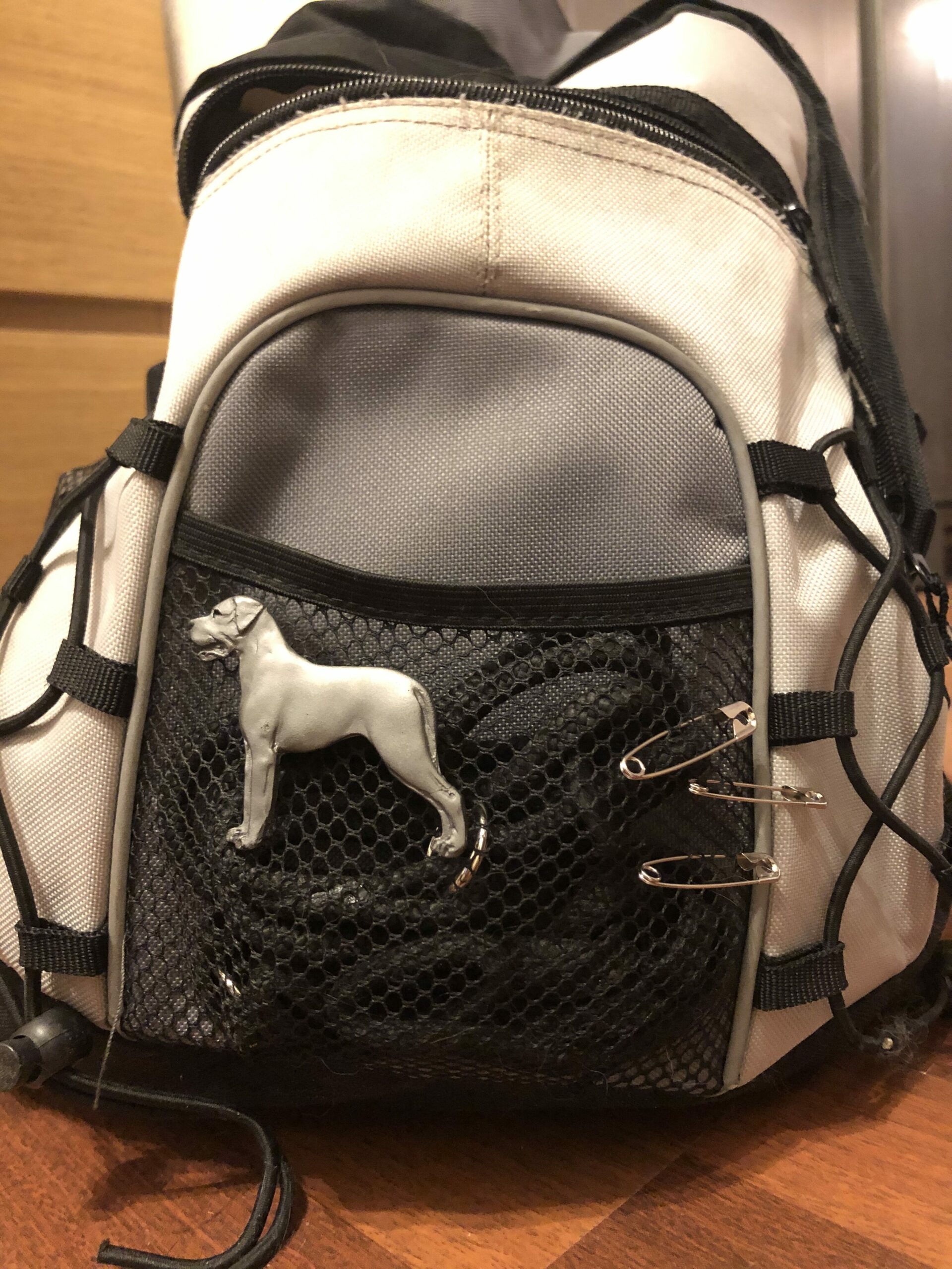 Olen tänään pakannut huolellisesti näyttelypakkauslistaa, ja tiedättekö minkä löysin? Löysin rintaneulan, joka on ollut hukuksissa useamman vuoden. Varmaan juuri niin kauan, kuin tämä näyttelytaukokin on kestänyt. Tämän rintaneulan olen ostanut Cruftsin näyttelystä Isosta-Britanniasta vuonna 2009, kun Hertta oli vasta tulossa meille. Neula on ollut ylläni hyvin, hyvin monessa näyttelyssä. Sitten se vähän kuin hukkui.