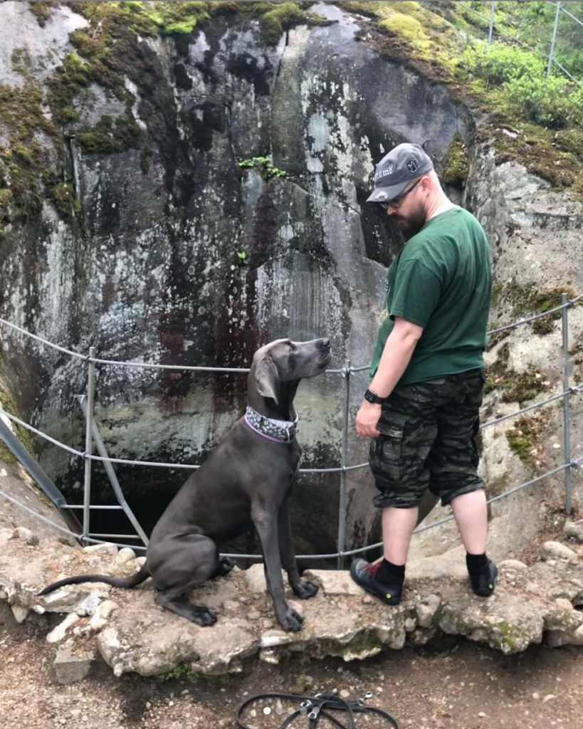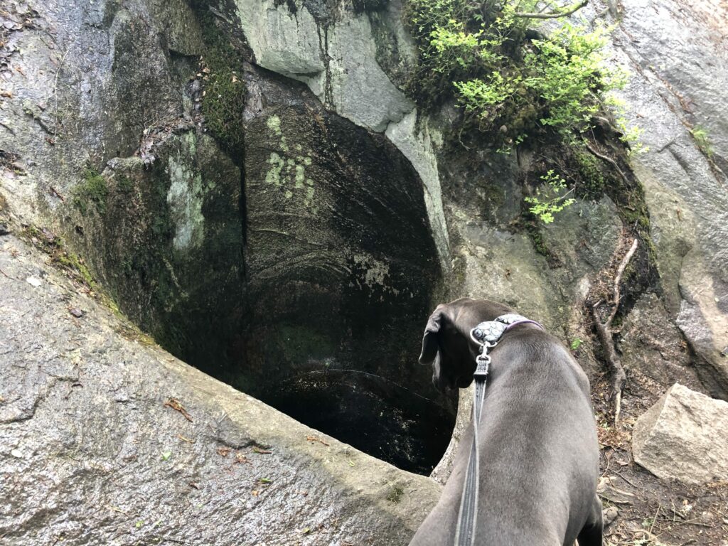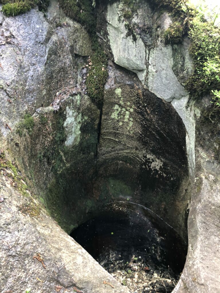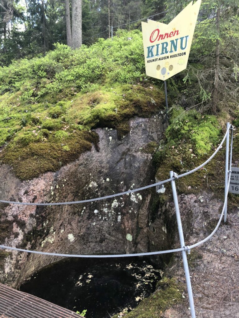 Isoin kirnu ei ollut nimittäin enää mikään pikku kuopa, vaan oikeastaan jo onkalo. Jättiläisen kuhnepytyksi (tarkoittaa Hiiden kylpyastiaa) ristitty onkalo on huikaisevat 10,2 metriä syvä ja leveimmillään 4,3 metriä. Jopa Venla osasi rauhoittua tällaisen jyrkänteen reunamalla.