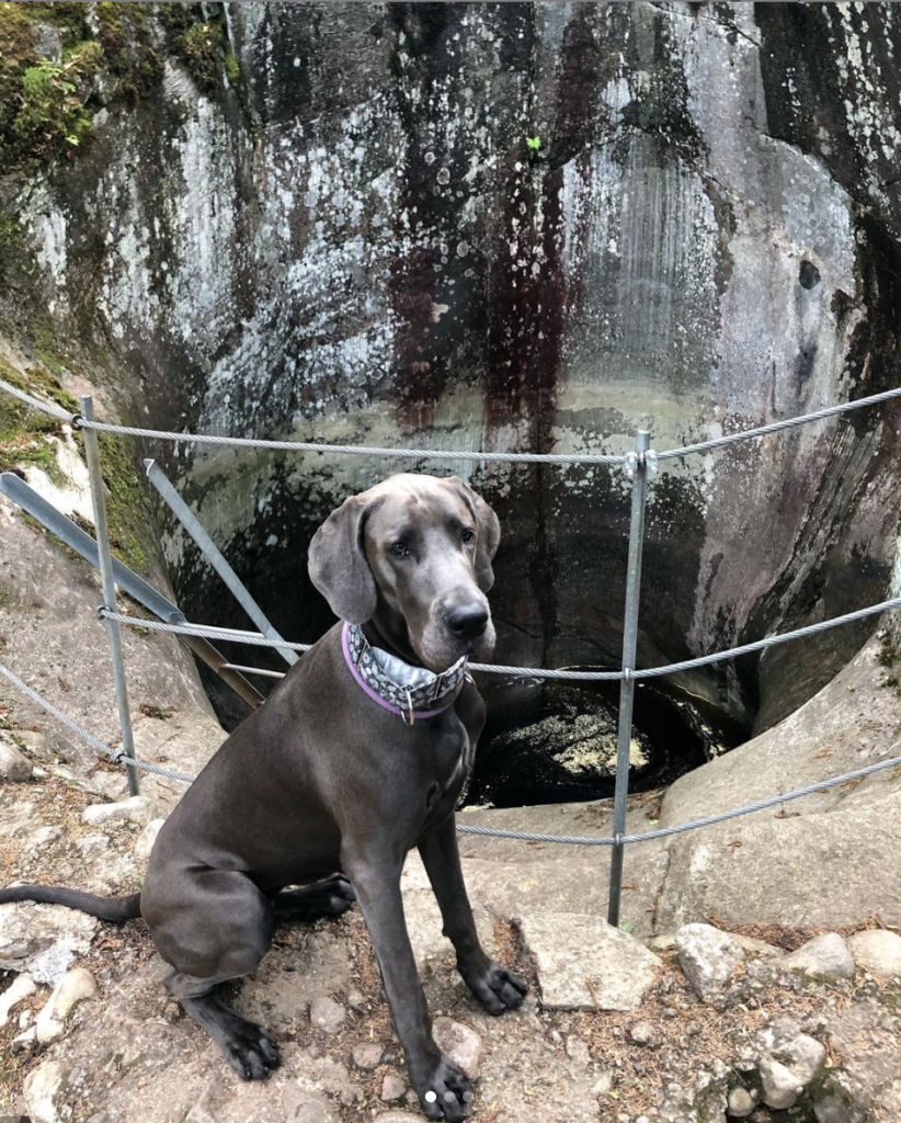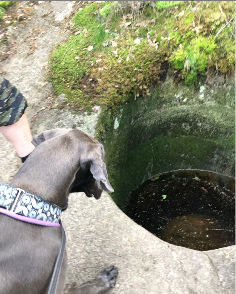 Pienen Venlan kanssahan alueella saikin olla sitten tarkkana. Nimittäin ennen kuin ehdin huomatakaan, oli koira seisomassa ensimmäisessä kohtaamassamme veden täyttämässä kirnussa suunnittelemassa juomataukoa. No, kansallisnähtävyyksissä ei sovi kylpeä tahi juoda, joten kiskaisin koiran äkkiä pois. Ja toisekseen, seuraava “juomakuppi” saattaisi huonossa lykyssä päästä yllättämään syvyydellään, jos sinne noin kepoisin askelin meinaa lampsia…
